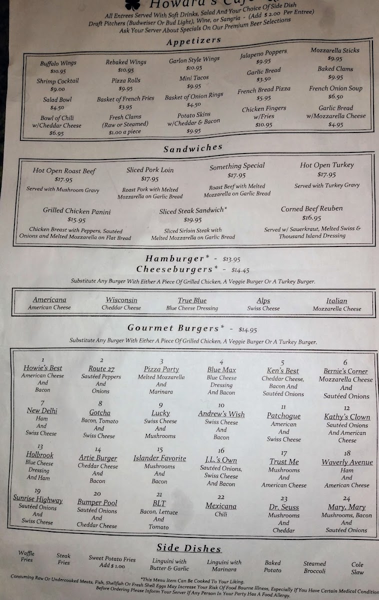The menu at Howard's Cafe offers a variety of American dishes and bar fare suitable for casual dining. It includes several categories to accommodate different preferences and meal times.